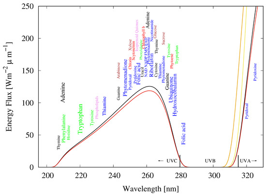 The spectrum of light available in the different UV regions at Earth’s surface before the origin of life at approximately 3.85 Ga and until at least 2.9 Ga (curves black and red, respectively) during the Archean. CO and probably some HS were responsible for absorption at wavelengths shorter than ∼205 nm and atmospheric aldehydes (comon photochemical products of CO and water) absorbed between about 285 and 310 nm [38], approximately corresponding to the UVB region. Around 2.2 Ga (yellow curve), UVC light at Earth’s surface had been extinguished by oxygen and ozone resulting from organisms performing oxygenic photosynthesis. The orange curve corresponds to the present surface spectrum. Energy fluxes are for the sun at the zenith. The names of the fundamental molecules of life, nucleic acids (black), amino acids (green), fatty acids (violet), sugars (brown), vitamins, co-enzymes and co-factors (blue), and pigments (red) are plotted at their wavelengths of maximal absorption (the font size of the letter roughly corresponds to the relative size of their molar extinction coefficient, i.e., how well they absorb). Note how closely these wavelengths of maximum absorption coincide with the Archean UV surface spectrum. Adapted from Michaelian and Simeonov [11].