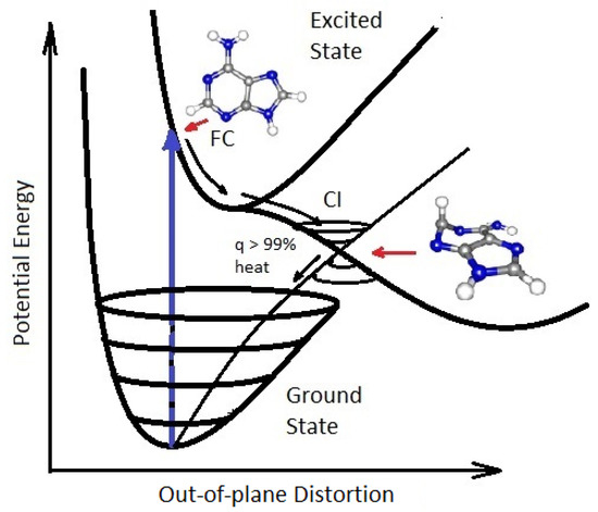 Conical Intersection (CI) for adenine (one of the nucleobases) showing the degeneracy of the electronic excited state with the electronic ground state after a UVC photon absorption event (blue arrow) which induces a nuclear coordinate deformation, known as pyrimidilization, from its original structure in the Franck-Condon (FC) region. In this deformed state, the vibrational states of the excited potential energy surface coincide in a region (CI) with the vibrational states on the ground state. Conical intersections provide rapid (sub-picosecond) dissipation of the original electronic excitation energy into heat. The quantum efficiency (q) for this dissipative route is very large, making adenine photochemically stable but, more importantly, very efficient at photon dissipation. Another common form of coordinate transformation associated with conical intersections are proton transfers within the molecule or with the solvent. Based on data from Andrew Orr-Ewing [39], Roberts et al. [40], Kleinermanns et al. [41] and Barbatti et al. [42]. Taken with permission from Michaelian [13].