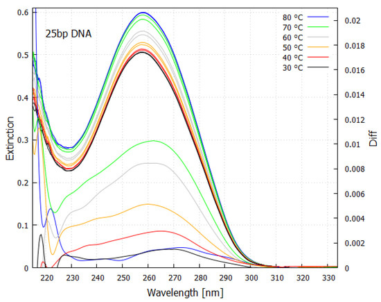 Absorption spectrum as a function of temperature for a 25 base-pair double helix DNA sample. An increase in absorption occurs with denaturing as the temperature is raised, known as the “hyperchromic effect”. The lower curves (right y-axis) are the spectrum differences taken about a 3 degree temperature bin at the specified temperature. Because of the Heisenberg uncertainty principle , strong absorption occurs over a wide region of wavelength ( large) since most of the de-excitation is very rapid ( small) through the conical intersection. This fundamental molecule of life absorbs strongly over most of the region that was arriving at Earth’s surface during the Archean (compare with Figure 5). Taken with permission from Michaelian and Santillán [24].