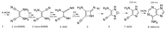 The photochemical synthesis of adenine from 5 molecules of hydrogen cyanide (HCN) in water, as discovered by Ferris and Orgel (1966) [53,54]. Four molecules of HCN are transformed into the smallest stable oligomer (tetramer) of HCN, known as cis-2,3-diaminomaleonitrile (cis-DAMN) (2), which, under a constant UVC photon flux isomerizes into trans-DAMN (3) (diaminofumaronitrile, DAFN) which may be further converted on absorbing two more UVC photons into an imidazole intermediate, 4-amino-1H-imidazole-5-carbonitrile (AICN) (7). Hot ground state thermal reactions with another HCN molecule or its hydrolysis product formamide (or ammonium formate) leads to the purine adenine (8). This is a microscopic dissipative structuring process which ends in adenine [19], a pigment with a large molar extinction coefficient at 260 nm and a peaked conical intersection which promotes the dissipation of photons at the wavelength of maximum intensity of the Archean solar UVC spectrum (Figure 5). Taken with permission from Michaelian [13].