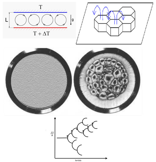 The Bénard cell apparatus consists of a hot lower plate and a cold upper plate with a liquid sandwiched between the two, with the system under the force of gravity. The onset of the dissipative structuring of the convection cells occurs as a result of an external force (temperature gradient) imposed over the system, and results from a non-linear relation between the flow of heat and the temperature gradient. The left part of the middle figure depicts the view from above for a linear relation between the force (temperature gradient) and the flow (heat flow) when the temperature difference over the system is small, below some critical value and results in a homogeneous system (no spatial symmetry breaking) and there exists only conduction of heat from the lower to upper plate. The right part describes the non-linear situation when the temperature difference between the two plates is greater than some critical value for which convection cells spontaneously arise (Bénard cells) and spatial symmetry breaking occurs. There are two stationary states allowed for this system once the bifurcation point (critical temperature gradient) is reached; one with the hot liquid coming up through the center, and the other with the hot liquid coming up around the edges of the approximately hexagonal cells. The greater entropy producing state is the one with the hot liquid coming up through the center of the cells and this is the state of greater probability and thus stability, given internal and external fluctuations of the material flow and temperature. This is shown in the bifurcation diagram at the bottom (see Figure 3) which describes the direction taken by the system in terms of entropy production as given by the arrows. The general trend is towards greater entropy production, but this is not always the case.