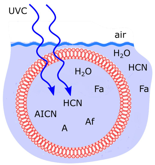 Fatty acid vesicle floating at the ocean surface microlayer, transparent to UVC light and permeable to the small molecules HO, HCN and formimidic acid (Fa) but impermeable to the photochemical reaction products (e.g., ammonium formate (Af), AICN, adenine (A)) which are larger in size and have larger dipole moments. Concentration profiles of the intermediate and final product molecules which most dissipate the incident UVC photon flux are the most stable and therefore statistically selected in this non-equilibrium thermodynamic sense. Taken with permission from Michaelian [13].