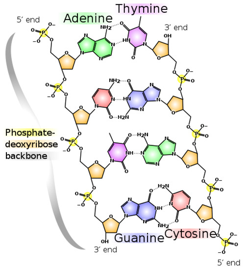 The nucleic acid polymer DNA. For polymerization of the nucleobases to be thermodynamically selected, it must have some photon dissipation enhancing characteristic. Bases are much more stable in polymer (less subjected to hydrolysis) but, more importantly, in polymer form one has a scaffolding which permits the attachment of molecules with UVC dissipation enhancing characteristics (for example, the amino acid tryptophan which may have acted as a UVC antenna, see Section 3.6). From Madprime (talk · contribs), CC0, via Wikimedia Commons.