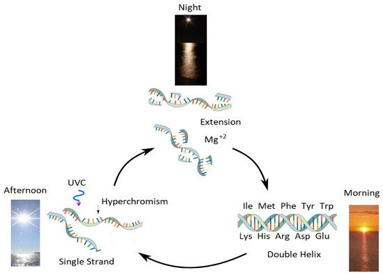 - Michaelian, K.; Santillan, N. UVC photon-induced denaturing of DNA: A possible dissipative route to Archean enzyme-less replication. Heliyon 2019, 5, e01902. [Google Scholar] [CrossRef] [Green Version]