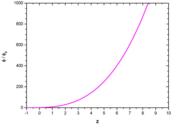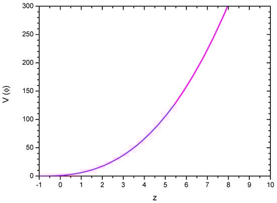 In the above Equation (32), the first term in the right-hand side bears the contribution of the cosmic anisotropy. In Figure 5, we show the evolutionary behaviour of the self-interacting potential for a given cosmic anisotropy. Since in the Big Rip scenario, we discussed in the present work a large negative value of is being required, the effect of the cosmic anisotropy becomes negligibly small. However, in other scenarios such as a bouncing one, we may get a substantial effect of the cosmic anisotropy on the self-interacting potential [36]. Because of this, we chose a representative value or a corresponding to plot the figure. The value of the self-interacting potential in the figure is normalized to its present value. One should note that, with the growth of cosmic expansion, decreases from a higher value to small values at late times. This behaviour may be translated in terms of the scalar field to infer that the self-interacting potential shows an increasing trend with the BD scalar field.