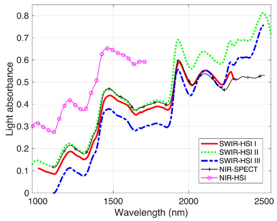 NIR spectra from the identified ROI on the transverse surface of the Douglas-fir samples examined by each NIR-HSI camera and NIR-SPECT are depicted in Figure 1. Compared to spectra obtained using NIR-SPECT (utilized here as a reference), spectra of the SWIR-HSI systems were all similar up to approximately 2000 nm, and then, differences in spectra amongst instruments become more apparent. In the spectral range of 2000–2500 nm, spectra based on images from the SWIR-HSI-I camera were most similar to the NIR-SPECT, which was followed by the SWIR-HSI-II camera, but absorbance values based on this camera decreased as wavelengths approached 2500 nm compared to the other instruments. SWIR-HSI-III in this region showed the greatest increase in absorbance beyond 2000 nm, but the spectra also appear nosier than other cameras in this region. NIR-HSI instrument spectra appear similar to those obtained using NIR-SPECT in the spectral range from 1100 to 1700 nm.