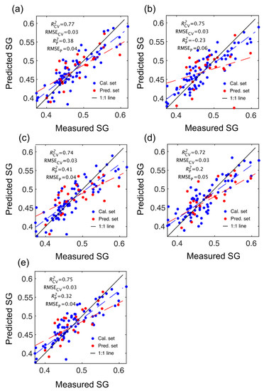 Figure 2 and Figure 3 illustrate the calibration and prediction performance for MOE and SG models, respectively, which were obtained using the wavelength range provided in Table 1.