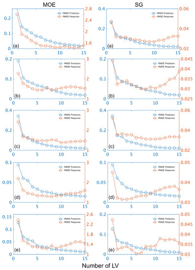 Two sets of Partial Least Squares (PLS) regression calibration models were constructed in this study; the first used all of the available wavelengths provided by each instrument (Table 1), whereas the second was constructed using a wavelength range limited to 1100–1700 nm to be consistent with the largest wavelength of the NIR-HSI instrument and the smallest wavelength for the benchtop NIR-SPECT instrument. Standard normal variate (SNV) and second derivative (gap-segment method; gap = 0, segment = 5) spectral pre-treatments were first used to correct the baseline shifts mainly caused by light-scattering effects [52,53]. A subset of samples (75%) was randomly selected for the construction of MOE and SG calibration models. Leave-one-out cross-validation was used to obtain the calibration models. The predictive performance of the calibration models was assessed using the remaining samples (25%) as a test set. The calibration and test set samples were the same for each instrument, and the measured MOE and SG values had similar ranges between the calibration and test sets (Table 2). The number of LVs was identified by analyzing model statistics where the optimal LV number was determined as a compromise between low model order, contribution rate and gain in the RMSE reduction. It was implemented by analysis of initial/first 15 LV determined for both calibration and validation data sets but limited to 6 for comparative purposes. The overall objective of this protocol was to minimize the risk of model overfitting and increase the overall reliability of prediction.