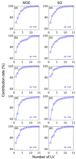Contribution rate (%) of latent variables (LVs) to stiffness (MOE) and specific gravity (SG) partial least squares (PLS) calibrations based on spectral data provided by SWIR-HSI-I (a), -II (b) and -III (c), NIR-SPECT (d) and NIR-HSI (e).