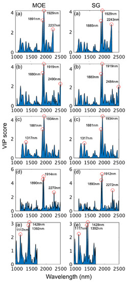 VIP scores of wavelengths used to build stiffness (MOE) and specific gravity (SG) partial least squares (PLS) calibrations based on spectral data provided by SWIR-HSI-I (a), -II (b) and -III (c), NIR-SPECT (d) and NIR-HSI (e).