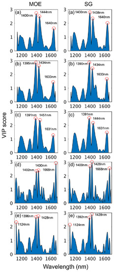 where is the number of samples in the data set, is the MC reference values, is their values predicted by the PLS regression analysis, and is the mean values of . Variable importance in projection (VIP) scores [54] were calculated to estimate the important wavelengths. A VIP score close to or greater than 1 can be considered important for model construction.