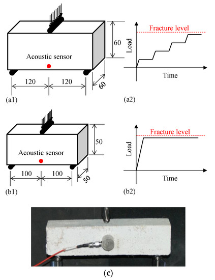 Two protocols were implemented. The first included beams dimensions of 60 mm × 60 mm × 260 mm. The supporting rollers were placed at a distance of 240 mm from each other (Figure 1a1). The fracture load for these beams was found equal to approximately 3.55 kN in terms of a preliminary series of experiments. These beams were subjected to a step-wise loading scheme: The load was increasing at a predefined level, and then it was kept constant until the complete attenuation of the acoustic activity. Then, the load was increased to a new level, and the procedure was repeated until the fracture of the specimens, which occasionally could be detected during a constant load stage, assuming that the load level attained was very close to the fracture load of the beam (Figure 1a2). A photo of a typical specimen while loaded is shown in Figure 1c.