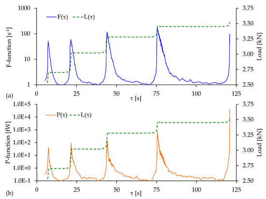 As a next step, the temporal evolution of the acoustic activity was described in terms of the F-function [16,17] (Figure 3a), and, in addition, the rate of release of the AE hit energy per unit time (power) was described in terms of the P-function [27] (Figure 3b). Again, the acoustic activity was considered in juxtaposition to the level of the externally applied load. As it is dictated by the procedure for the optimum representation of both the F- and P-functions, the time axis (τ) corresponds to the mean value of the time instants at which the successive acoustic hits (comprising the group of hits used to calculate each value of the F- and P-functions) were recorded.