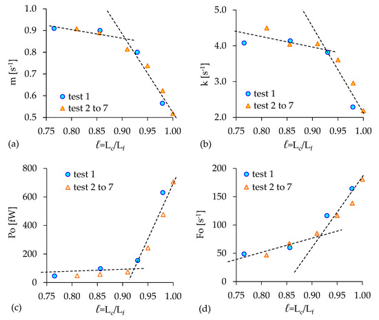 The variation of exponent m (a), exponent k (b), constant Po (c), and constant Fo (d) versus the normalized (over the respective maximum value) load applied (dotted lines indicate linear fit).