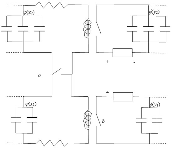 The homologous ends of all groups ψ(xi) are connected to the corresponding two ends of switch a. Closing a involves short-circuiting all the groups of capacitors associated with function ψ. The opposite charges are recombined, and ψ is canceled. The closing of a also implies, as an automatic consequence, the closing of other switches such as b. The latter, in turn, implies the charging of all the groups of capacitors associated with function ϕ.