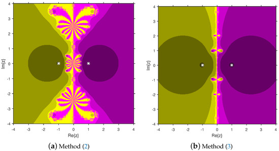 Firstly, we select a second-degree polynomial to show the attraction basins for solvers (11) and (12) in Figure 1a and Figure 1b, respectively. In these figures, magenta and yellow regions denote the attraction basins of the zeros 1 and , respectively, of . Figure 2a and Figure 2b represent the attraction basins for solvers (11) and (12), respectively, related to the zeros of . In these diagrams, the basins of , 1 and are displayed in magenta, yellow and cyan, respectively. Next, a fourth-degree polynomial is chosen to demonstrate the attraction basins for solvers (11) and (12) in Figure 3a and Figure 3b, respectively. The basins of the solutions , , 1 and i of are, respectively, displayed in blue, green, red and yellow regions in these figures. Furthermore, we use a fifth-degree polynomial to construct the basins for solvers (11) and (12) in Figure 4a and Figure 4b, respectively. In these pictures, yellow, magenta, blue, green and red colors are applied to represent the attraction basins of the zeros , , 1, and , respectively, of . Finally, the sixth-degree complex polynomials , and are taken. Figure 5a and Figure 5b provide the attraction basins for solvers (11) and (12) related to the zeros , 1, , , and of in red, green, magenta, blue, yellow and cyan colors, respectively. Then, is selected to illustrate the basins for solvers (11) and (12) in Figure 6a and Figure 6b, respectively. In these diagrams, red, green, magenta, blue, yellow and cyan colors are applied to display the basins associated with the solutions , , , , and of , respectively. In Figure 7a and Figure 7b, the basins for solvers (11) and (12) related to the roots , , , 1, i and of are painted in blue, yellow, green, magenta, cyan and red, respectively.