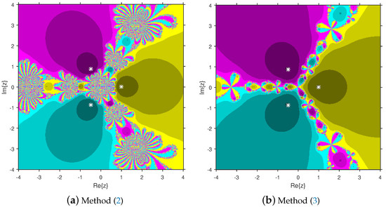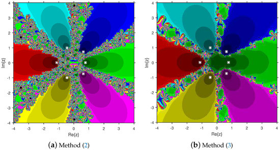 Let the sequence stand for the sequence of iterates produced by an iterative algorithm starting from . The set of points constructs the attraction basin related to a zero of , where O indicates a second or higher degree polynomial with complex coefficients. The area × on is used with a grid of points to create attraction basins. Every point is regarded as a starting estimation, and solvers (11) and (12) are applied to seven different test functions. The point remains in the basin of a zero of a test function if . We paint the starter using a specific color associated with . Based on the number of iterations, we assign the light to dark colors for each initial guess . If is not a member of the attraction basin of any zero of the test polynomial, it is displayed in black color. If , then we stop the iteration procedure. Otherwise, we terminate the process after 400 iterations. The test polynomials are selected from [8,17,18]. The fractal pictures are constructed with the help of MATLAB 2019a.