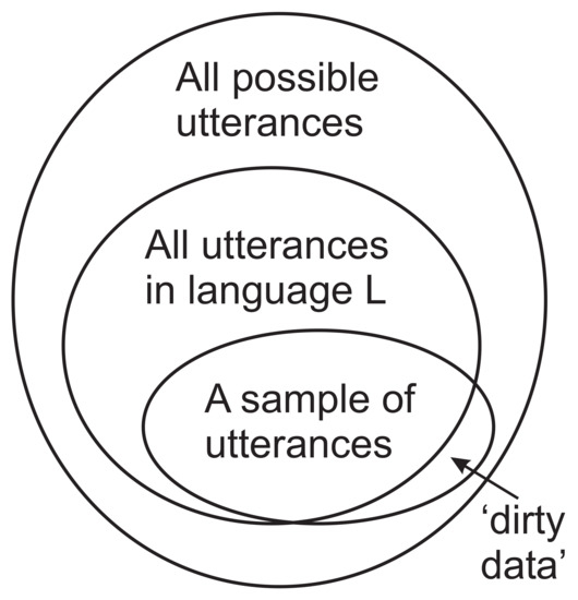 Each child learns a language L from a sample of things that they hear being said by people around them. Although the sample is normally large, it is nevertheless, finite. (It is assumed here that the learning we are considering is unsupervised. This is because of evidence that, although correction of errors by adults may be helpful, children are capable of learning a first language without that kind of error correction [16,17].) That finite sample is shown as the smallest envelope in Figure 2. ’Dirty data’, meaning data containing errors, is discussed below.