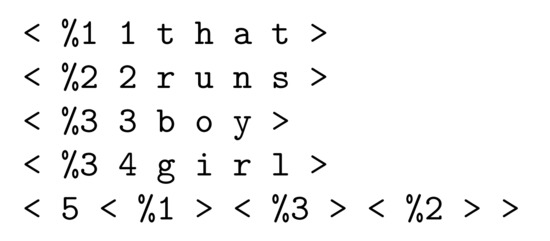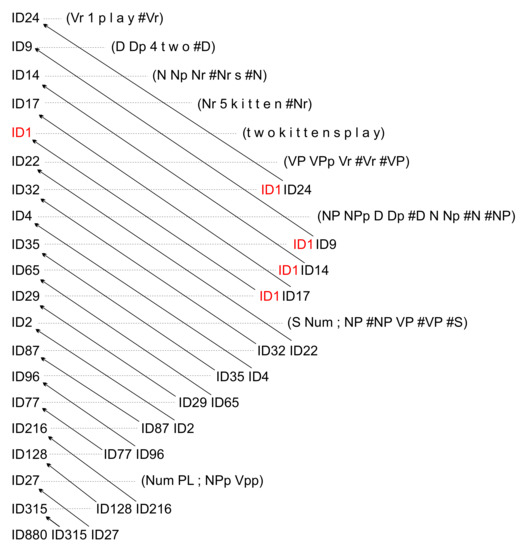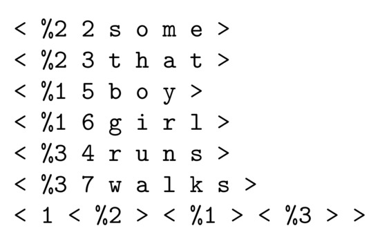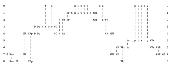 In Figure A3, a number dependency (plural) is marked in row 8 by the SP-pattern ‘Num PL; NPp VPp’. Here, the SP-Symbol ‘NPp’ marks the noun phrase as plural, and the SP-symbol ‘VPp’ marks the verb phrase as plural. As is required for the marking of discontinuous dependencies, this method can mark dependencies that bridge arbitrarily large amounts of intervening structure.