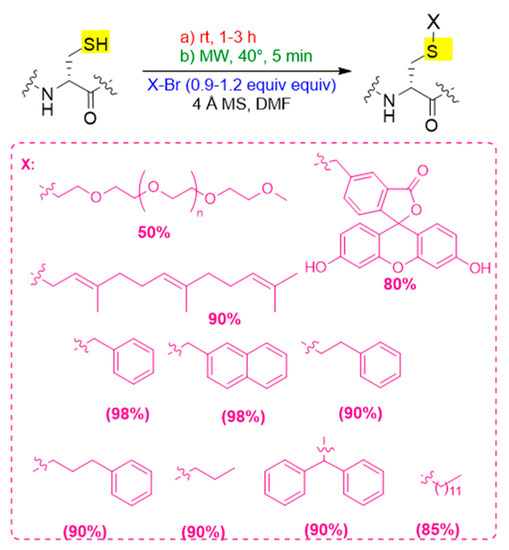 - Calce, E.; Leone, M.; Monfregola, L.; De Luca, S. Chemical Modifications of Peptide Sequences via S-Alkylation Reaction. Org. Lett. 2013, 15, 5354–5357. [Google Scholar] [CrossRef] [PubMed]