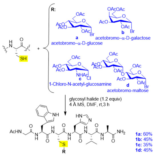 - Calce, E.; Digilio, G.; Menchise, V.; Saviano, M.; De Luca, S. Chemoselective Glycosylation of Peptides through S-Alkylation Reaction. Chem. Eur. J. 2018, 24, 6231–6238. [Google Scholar] [CrossRef]