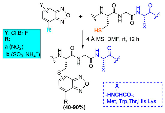 - Verdoliva, V.; Digilio, G.; Saviano, M.; De Luca, S. Thio-conjugation of substituted benzofurazans to peptides: Molecular sieves catalyze nucleophilic attack on unsaturated fused rings. Catal. Sci. Technol. 2021, 11, 1067. [Google Scholar] [CrossRef]