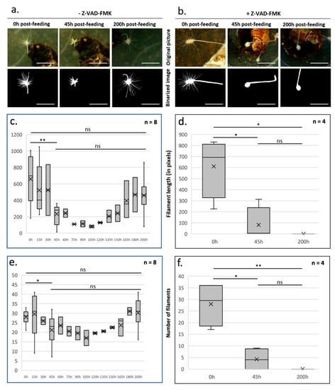 Quantitative approach to investigate caspase-dependent morphofunctional homeostasis during the feeding cycle of Lycopodina hypogea. After 2 months of starvation, a feeding cycle was initiated by putting Artemia nauplii shrimp on the sponge filaments involved in prey capture, in the absence (a,c,e) or presence of Z-VAD-FMK (pan-caspase inhibitor, Euromedex, 1050A) (b,d,f). Sponges were filmed for 72 h, and images were acquired at the indicated times with a camera (SONY E3CMOS) coupled to a stereoscopic microscope (Nikon SMZ-2B) (upper panels). Scale bar: 5 mm. The original images were binarized with ImageJ (lower panels) [,,] for the quantitative analysis, expressed in pixels, of the length (c,d) and number (e,f) of prey capture filaments. Specifically, images were preprocessed to retain only the green channel (Split channel) [] in which the sponge was better visualized (brightness, contrast, and grain). The step before the morphological analysis (detecting and delimiting the sponge edge and biomass and detaching it from the rest of the image, such as support, water particles, and prey) was image binarization, performed by adjusting the threshold (Adjust threshold) [,]. This resulted in an image where the pixels of interest (sponge) had a value of 1 and the background of the image had a value of 0. To permanently remove the background noise, a mask was applied (Clear outside). The last step was to segment and quantify the object with a particle analysis (Analyze particles) [,]. The result was the number of pixels that constituted the object. As there is no scale on the image, the image resolution was previously standardized. Knowing the pixel size of each image, the sponge biomass and the filament length were quantified using the pixels as the unit (Measure). In (c–f), the box and whisker plots represent the 10th and 90th percentiles, with the first, second (median), and third quartiles. X represents the mean. Error bars indicate the standard error of the mean (n = 8 sponges without Z-VAD-FMK and n = 4 sponges with Z-VAD-FMK); ns, not significant (p value > 0.01); * p value < 0.01; ** p value < 0.001 (t test, R software). The first analysis with the t test confirmed the homogeneity of samples/data in each condition. Then, the analysis compared the two conditions.
