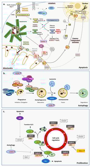 Schematic representation of the main mechanisms involved in tissue homeostasis: apoptosis (a), autophagy (b), and cell cycle regulation (c). Dashed outline and grey color transcripts of proteins not found in any step of the L. hypogea feeding cycle in the transcriptomic study; colored names, transcripts of proteins detected in the transcriptomic study; bold, red, and underlined names, transcripts of proteins expression that is regulated during feeding. Red arrows indicate a decrease or increase of the gene expression level.