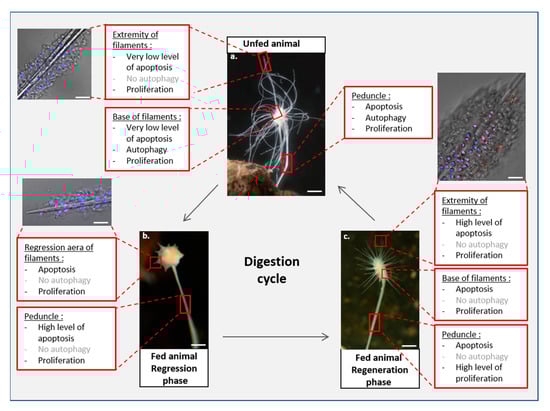 Regulation of apoptosis, autophagy, and proliferation during a feeding cycle in L. hypogea. In unfed animals, proliferation is observed in all parts of the sponge. Apoptosis is mainly present in the peduncle. Autophagy occurs in the peduncle and at the base of filaments (a). During the regression phase after feeding, autophagy is inhibited in regressing filaments, and the peduncle undergoes high levels of apoptosis. Proliferation is still present (b). The regeneration phase is associated with a moderate level of cell proliferation in filaments and a high level of proliferation in the peduncle. No autophagy is observed. Apoptosis is present everywhere but with higher rates at the tip of the filaments and in the peduncle. (c). Examples of immunofluorescent labeling obtained at the end of the filaments are presented together with phase images showing the silica filaments. The sponges were fixed for 30 min with 4% paraformaldehyde in filtered seawater and then permeabilized for 20 min at room temperature with 0.2% Triton X-100 in TS buffer (150 mM NaCl, 25 mM Tris, and pH 7.5). Fixed and permeabilized sponges were labeled with DAPI (Euromedex, 1050A) and TUNEL (Merck, In Situ Cell Death Rhodamine Detection Kit, 12,156,792,910) as previously described []. The blue labeling corresponds to a DAPI labeling of nuclei. Red labeling corresponds to TUNEL-positive nuclei. Scale bar: 3 mm (stereoscopic microscope Nikon SMZ-2B images) and 150 μm (confocal microscope Leica TCS-SPE images).