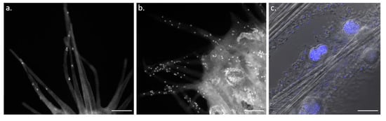 Accumulation of spermatophores in the prey capture filaments after two months of starvation (a) and during filament regression after feeding (b) in L. hypogea. Fluorescence stereomicroscope (Olympus MC5) images after DAPI staining (Euromedex, 1050A) (a,b). Confocal microscopy (Leica TCS-SPE) image of mature spermatophores on the filament (starved sponge) after DAPI staining of spermatophore nuclei (blue). The sponges were fixed for 30 min with 4% paraformaldehyde in filtered seawater and then permeabilized for 20 min at room temperature with 0.2% Triton X-100 in TS buffer (150 mM NaCl, 25 mM Tris, and pH 7.5). Fixed and permeabilized sponges were labeled with DAPI as previously described []. (c) (Montpellier RIO Imaging platform, France). Scale bar: 3 mm (a,b), 35 µm (c).