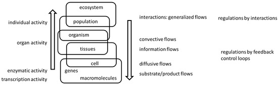 A general picture of levels of biological regulation/control. While the reductionist view would consider the upward processes at the left-hand side of the scheme as mandatory in controlling flows, the downward closed loops shown on the right-hand side create an entanglement between levels of biological organization that somehow precludes a simple cut-off of what is a controlled and what is a regulated variable (see, for instance, [9,10]). This is valid within the organism and among organisms as well since the biotic and abiotic environments would also dictate access to resources.