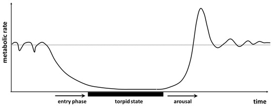 Schematic representation of a torpor bout in a small bird or mammal. Based in [39,40].