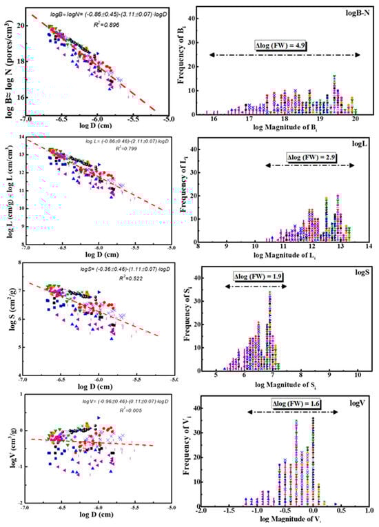 In Figure 3, left quartet, we plot separately the values of those four pore properties j = Vi, Si, Li and Bi as a function of their pore size diameter Di (cm) in logarithmic form, e.g., logji = a − q·logDi. The result is four different power laws expressing the distributions of these parameters. Each line is the result of 206 points corresponding to 17 different categories of porous solids mentioned above. The points for each of those 17 sub-sets are indicated by different-colored points; for details, see ref. [].