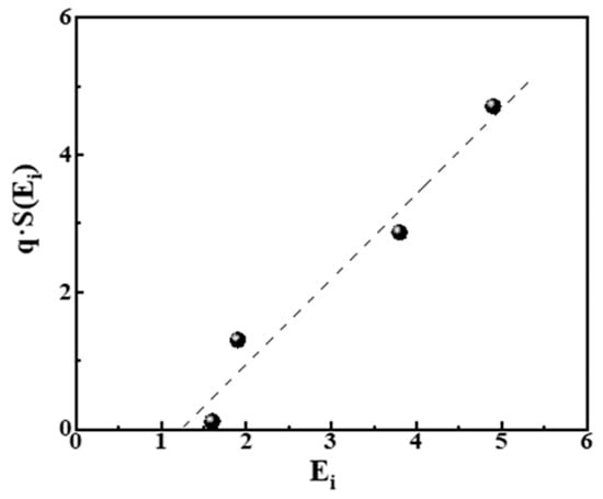 Plot of qi·S (Ei) = f (Ei) from the data in Table 3. The linear relationship (dashed line) corresponds to qi·S (Ei) = −1.5 + 1.2Ei with R2 = 0.961.