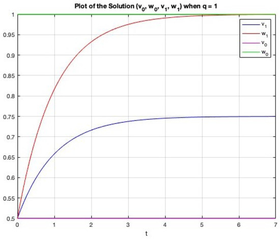 The Figure 1, Figure 2 and Figure 3 illustrate that for , and 1. As , the solutions exactly match with integer order result as a special case. Note that the computation of and involves linear Caputo fractional differential equations with variable coefficients. There is no representation form for the solution of linear Caputo fractional differential equations with variable coefficients. Therefore, we plan to develop this result in our future work.