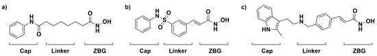 FDA-approved treatments for the inhibition of HDAC, Vorinostat (a), Belinostat (b), and Panobinostat (c) are shown with the cap group, linker, and zinc-binding group (ZBG) moieties known to be important for the inhibition of HDAC.