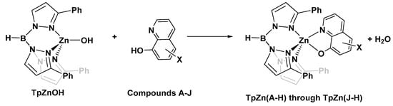 With the knowledge that 8HQs bind more strongly than hydroxamates, we selected 10 8HQ derivative molecules to examine which have a variety of electron-donating or -withdrawing substituents in several different locations (Figure 4). These initial 10 were selected based on their commercial availability. Of these, only the unsubstituted ligand A has been bound, binding the TpZn system. To our knowledge, 8HQs have not been studied versus HDAC8, but they have been used to target a variety of other metal-based proteins. Compound B is clioquinol, which has been used as an antibacterial and antifungal compound [38,39], and compound C is nitroxoline, which has been used as an antibacterial compound and has shown promise as an anti-amoeba treatment [40,41]. The TpZnOH complex was synthesized as per previous reports and reacted with compounds A–J to form TPZn(A–J). The products were generally yellow to orange powders. The reaction scheme is shown in Figure 5.