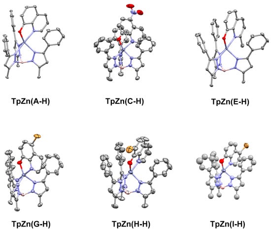 Single crystal X-ray structures of TpZn(A-H), TpZn(B-H), TpZn(C-H), TpZn(E-H), TpZn(G-H), TpZn(H-H), and TpZn(I-H), with ellipsoids shown at 50% probability and hydrogen atoms excluded for clarity. Co-crystallized solvents were also excluded. The CCDC numbers are listed in Table 1. TpZn(H-H) is of poor quality but shows overall connectivity.