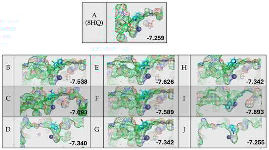 Protein–ligand docking of 8HQ derivatives with HDAC8 and their associated docking scores reported in kcal/mol, with the letter of the compound shown to the left of the electrostatic potential map of the protein–ligand complex.