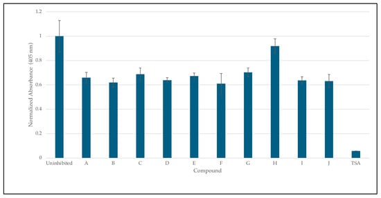 Inhibition studies of HDAC 8 with 8HQ derivatives. The negative control was shown as an uninhibited enzyme, and the positive control was shown as trichostatin A (TSA) a stand-in for SAHA. Error bars are displayed, and all compounds are significantly significant (p < 0.05) except for H (0.19).