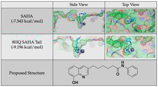 Protein–ligand docking of a proposed molecule for future study generated by adding a SAHA tail to 8HQ and a comparison of its docking and docking score to that of SAHA.