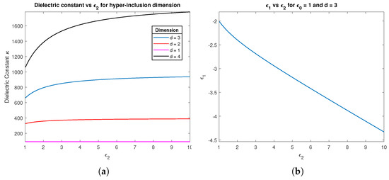 For any given value of the corresponding constitutive parameter that gives a polarisation and hence a dielectric function that tends to infinity is given by (45). Since the expression for as given by (45) makes the dielectric function of the material go to infinity very quickly, it means that it is a mathematical singularity. By subtracting a small value of choice from the singular value, one can tune the value of so that it can take large or small values. When the dielectric function of the material is infinite and for other values, for example the dielectric function of the material is very large but otherwise not infinite. For parameters as given in Figure 1, the variation in the constitutive permittivity as a function of is shown in Figure 2a for integer dimensional hyperinclusions that achieve very large values for the dielectric constant. Even larger values can be obtained when .