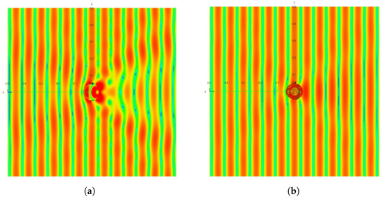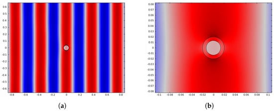 A composite material was modelled as shown in Figure 3. At a frequency of GHz, an electromagnetic wave was considered that propagated from left to right as shown in Figure 3a. In both Figure 3a,b an electromagnetic ‘hole’ was obtained where the field did not penetrate inside a spherical inclusion (2D cross section) but left the inside unaffected by the EM waves. This validates the notion that regions can be made to reduce large fields to zero or close to zero via the use of hyperinclusions inside the material. As a result, in such regions, the probability of electrostatic discharge is minimised, amongst other things.
