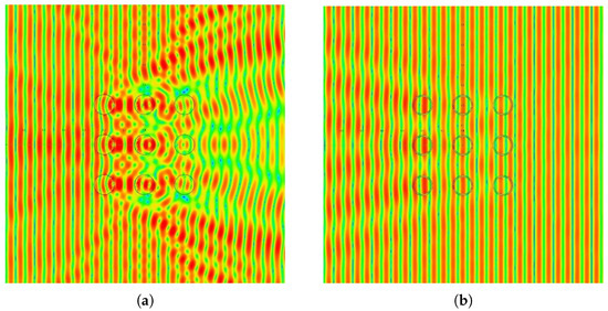 (a) Scattering of a transient electromagnetic field of frequency GHz travelling from the left by homogeneous inclusions in an array inside a material medium with . The inclusions have a radius of cm and . (b) Elimination of the forward scattered EMI/RFI to the right by the inclusion array where cm, cm, , and for each of the inclusions in the array. Note that all the constitutive parameters are positive.