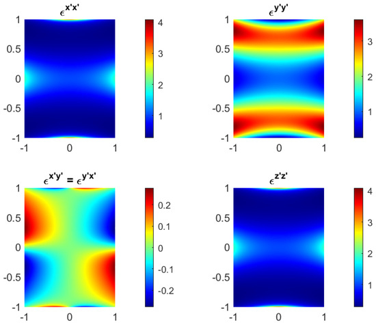 The constitutive tensors of an inhomogeneous material under compression via under the transformation coordinates (117). The tensor components and show a localised variation in the permittivity approaching infinity just as in the case of inclusions in a medium as discussed in Section 3. Here, .