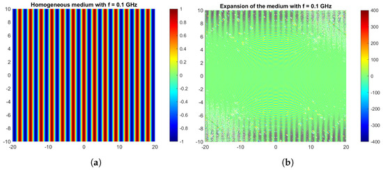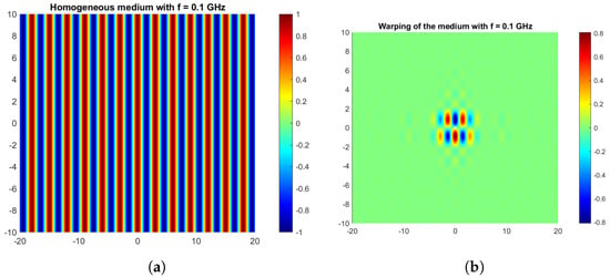 (a) An electromagnetic wave propagating in a homogeneous medium at a frequency of GHz. (b) The same electromagnetic wave propagating inside the modified medium which has undergone an expansion of its geometry via a transformation of the permittivity (or permeability) according to (118). Notice that in this case, the field is reduced in the middle regions of the medium close to or equal to zero. Here, and .