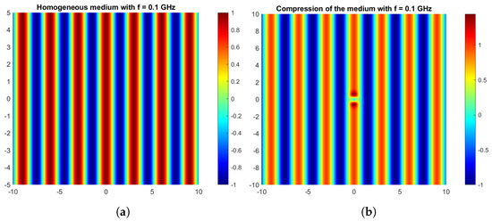 (a) An electromagnetic wave propagating in a homogeneous medium at a frequency of GHz. (b) The same electromagnetic wave propagating inside the modified medium which has undergone an expansion of its geometry via a transformation of the permittivity (or permeability) according to (139).