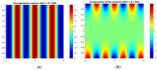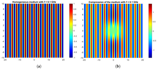 (a) An electromagnetic wave propagating in a homogeneous medium at a frequency of GHz. (b) The same electromagnetic wave propagating inside the modified medium which has undergone a compression of its geometry via a transformation of the permittivity (or permeability) according to (117) with .