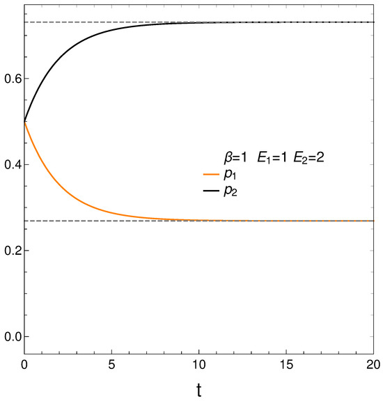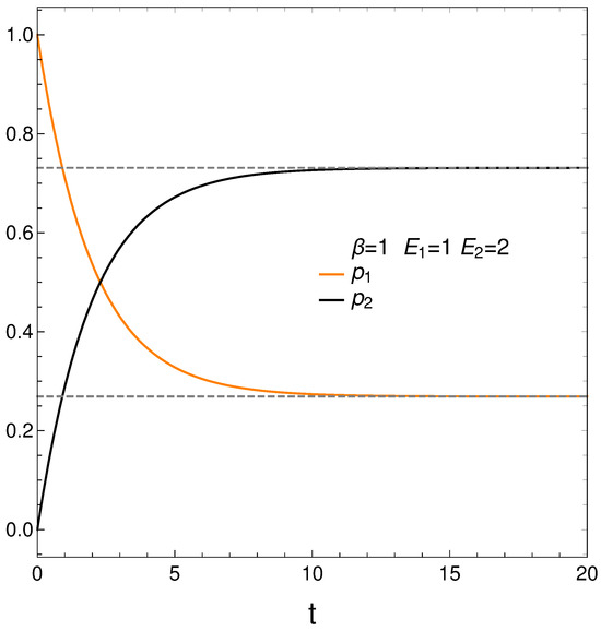 In analyzing our master equation, time is always measured in arbitrary units. We start by looking at the time evolution of our two probabilities in Figure 1. We see that they eventually cross each other, which anticipates an interesting situation.