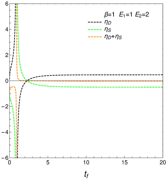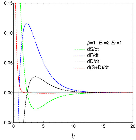 that determine how much free energy is expended or received so as to change either the disequilibrium or the entropy. We call them approximate because, strictly speaking, T and, as a consequence, F are strictly determined only at the final evolution-stage of stationarity, where there is equilibrium with the heat reservoir. Anyway, our ’s behavior is rather surprising, as can be seen in Figure 5. The free energies required to effect our changes diverge at the time at which where the entropy is a maximum, which we called . The divergence at this time indicates a temporary singularity.